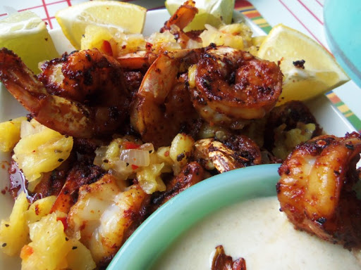 3. To cook the shrimp, I like using a large griddle that covers both the front and back burner on the stove top. But, you could also skewer and grill the shrimp, just make sure you brush it with oil before you grill it. If cooking on the stove top, preheat the griddle to medium heat for a few minutes. Drizzle olive oil to cover evenly. Lay the shrimp, but do not overcrowd or it will steam and not blacken. Cook for just 2 minutes per side or when shrimp turns pink. Transfer to bowl and cover to keep warm.