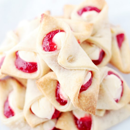 Fill the center of each square with 1/2-teaspoon cream cheese mixture and 1/2 teaspoon strawberry jam. For a prettier presentation, using a pastry bag, you can pipe the fillings, one on top of the other.