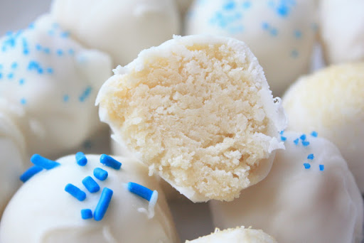 Dip each ball into white chocolate with a fork tapping off the excess. Return to baking sheet to set. Sprinkle with sprinkles while white chocolate is still wet.
