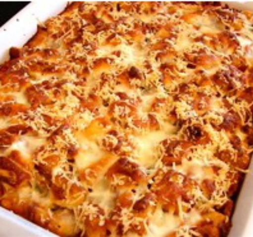 Place the chicken in the bottom of the dish in a single layer. Sprinkle the minced garlic, red pepper flakes and basil evenly over the chicken. Spread the sauce evenly across the top. On top of the sauce, sprinkle ¾ cup of the Mozzarella and one ounce of the Parmesan evenly across the dish. Sprinkle the crushed croutons across the top and follow with the rest of the cheese cheese.