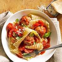 3. Add baked meatballs to warm Fresh Tomato Sauce; heat through. Serve over hot lasagna noodles.