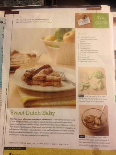 Use and oven mitt to carefully remove the dish from the oven. Pour the batter over the apples, then bake the pancake until it’s puffy and golden brown, approximately 25 -30 minutes. Let it cool slightly on a wire rack. Dust the pancake with confectioner’ sugar and cut into wedges before serving.