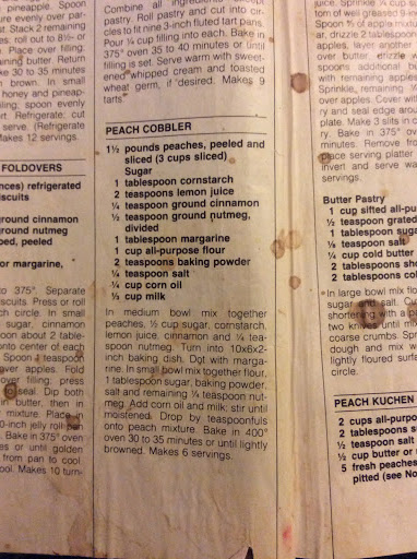 In medium bowl mix together peaches, 1/2 cup sugar, cornstarch, lemon juice, cinnamon and 1/4 teaspoon nutmeg. Turn into 10x6x2-inch baking dish. Dot with margarine. In small bowl mix together flour, 1 tablespoon sugar, baking powder, salt and remaining 1/4 teaspoon nutmeg. Add corn oil and milk. Stir until moistened. Drop by teaspoonfuls onto peach mixture. Bake in 400 degree oven 30 to 35 minutes or until lightly browned. Makes 6 servings.