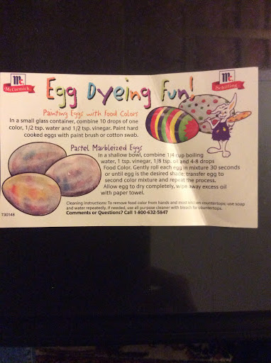 Mix 1/2 cup boiling water, 1 teaspoon vinegar and 10 to 20 drops food color in a cup to achieve desired colors. Repeat for each color. Dip hard-cooked eggs in dye for about 5 minutes. Use a slotted spoon, wire egg holder or tongs to add and remove eggs from dye. Allow eggs to dry.