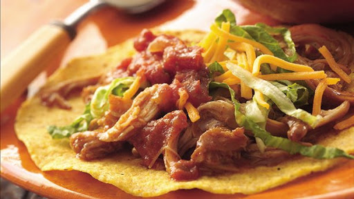 3 Remove chicken from cooker; place on cutting board. Shred chicken using 2 forks. Return chicken to cooker and mix well. Using slotted spoon to remove chicken mixture from cooker, place 1/3 cup chicken mixture on each tostada shell. Top with lettuce, cheese, salsa and sour cream.