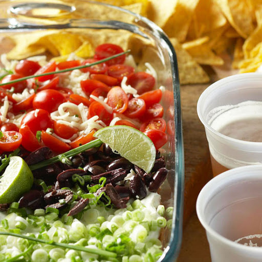 2. Before serving, sprinkle tomatoes, well-drained olives, and onions over sour cream. Sprinkle cheese over tomatoes. Sprinkle onion tops. Pass lime wedges. Makes 8 to 10 (1/2 cup) servings.