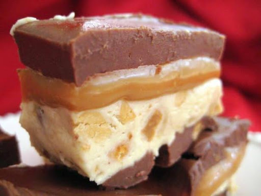 1 Melt together 1 cup milk chocolate chips, 1/4 cup butterscotch chips, and 1/4 cup creamy peanut butter then spread on bottom of 9 X 13 cake pan- put in refrigerator or freezer to set up while next layer is prepared. 2 Boil 1/4 cup butter, 1 cup sugar, and 1/4 cup evaporated milk together for 5 minutes. 3 Take off stove and add 1 1/2 cups marshmallow creme, 1/4 cup creamy peanut butter, 1 teaspoon vanilla, and 1 1/2 cups salted and chopped peanuts. 4 Pour over first layer that was chilling then place back in freezer. 5 Melt 14 ounces of caramels with 1/4 cup whipping creme until smooth then pour over second layer that is chilling- place back in freezer. 6 Melt together 1 cup milk chocolate chips, 1/4 cup butterscotch chips, and 1/4 cup creamy peanut butter then spread on the top of of third layer in the pan. 7 Return to chill until set up. 8 Store in refrigerator to keep from getting too soft and to aid in cutting and serving. 9 Too wonderful for words!