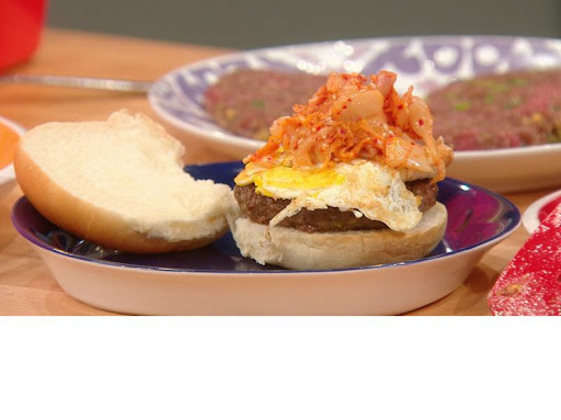 Toast buns 1-2 minutes on remaining heat of grill. Place patty on bun, top with a fried egg and then finish it off with a spoonful of kimchee slaw.