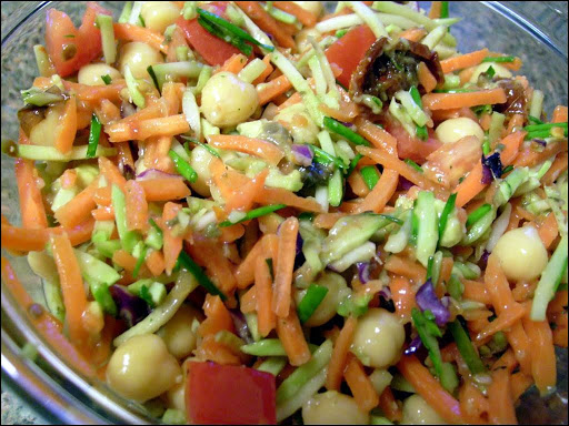 Put into a large bowl the broccoli slaw, grated carrots, sundried tomatoes, fresh tomato, chickpeas, avocado, and chives.