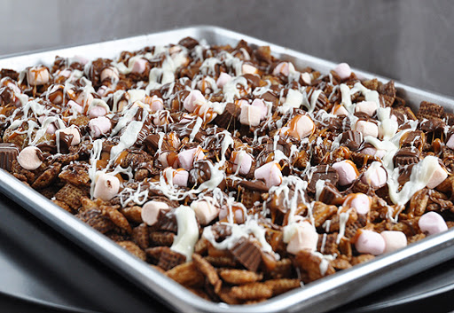 Make sure Chex mixture is cool to the touch (so candy doesn't melt.) Evenly sprinkle mini peanut butter cups candy and miniature marshmallows over Chex mixture.