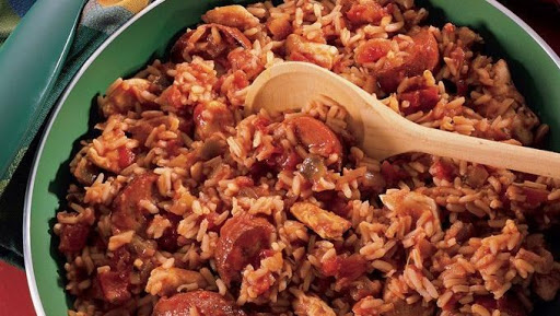 Cut sausage in half lengthwise: cut crosswise into 1/4 inch slices. In 10 inch skillet, combine sausage and remaining ingredients; mix well, breatking up tomatoes with large spoon. Bring to a boil. Reduce heat, cover and simmer 20 minutes. Remove from heat; let stand covered 5 minutes.