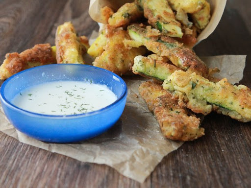 3. Serve fried zucchini strips hot with ranch dressing for dipping.