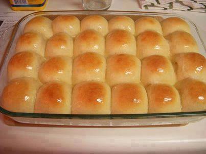 Bake in 350 degree fahrenheit oven for 20 minutes. Brush tops of rolls with butter (or equivalent).