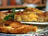 Melt the butter in the skillet over medium heat. Add the egg mixture, tilting the pan so that the eggs spread out into a thin layer. Once you see the eggs on top cover the skillet and cook until completely set and cooked through, about 10 minutes. Carefully slide the frittata onto a serving dish, slice into wedges, and serve with bread cubes sprinkled on top.