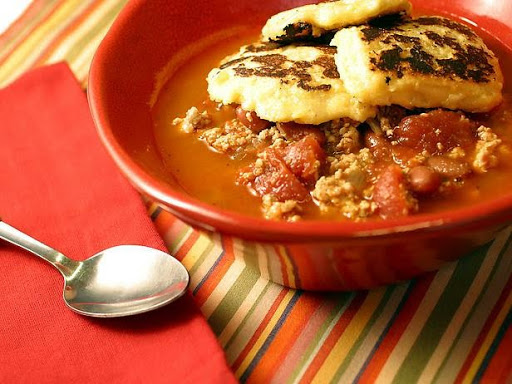 Turkey Chipotle Chili with Pepper Jack Cheese Corn Cake Toppers