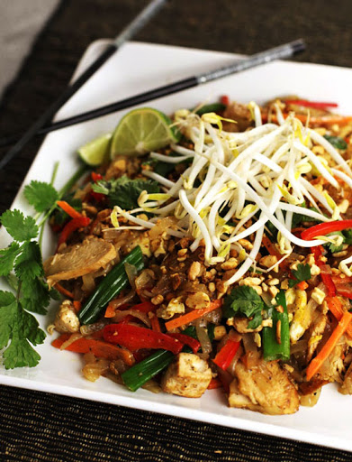 Transfer the noodles to a serving dish. Sprinkle the top with the roasted peanuts, bean sprouts, and cilantro.