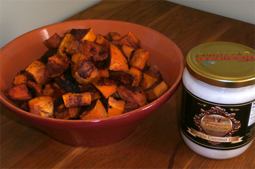 Coat sweet potato cubes with coconut oil. Sprinkle seasonings on and toss until evenly coated. Place in shallow roasting pan in one layer. Bake for 45 minutes or until desired doneness and crispness.