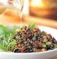 Combine cabbage with dressing. Drain lentisl and add to cabbage while hot. Before serving, toss with bacon, onions and croutons.