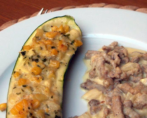 # Flip the filling over the zucchini shells. Bake at 200 degrees C until the filling is set (for about 15 min).