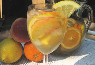Pour wine, schnapps, and Cointreau in a pitcher (I like to use a clear pitcher because the fruit makes it look so pretty). Add thinly sliced peaches, lemon, and orange. Next, add sugar and stir gently. Chill mixture for at least one hour before serving. Serve in wine glasses over ice. Pour glasses 3/4 full of sangria, and then add a splash of ginger ale or sparkling water in each glass just before serving.