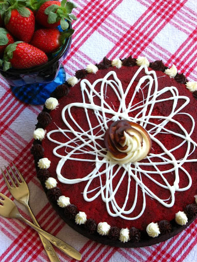 This cake can be prepared ahead of time. On the first day, prepare the red velvet cake, cool it, and freeze it. On the second day, prepare the cheesecake. You can then assemble and decorate right away, or leave this for a third day.