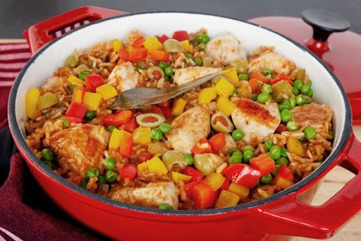 For sofrito: Add onion, bell pepper and garlic to oil in casserole, cook over medium heat heat until soft but do not brown, about 1 or 2 minutes. Add tomato and cook for one more minute. Return chicken to casserole with sofrito and cook for about 1 or 2 more minutes.