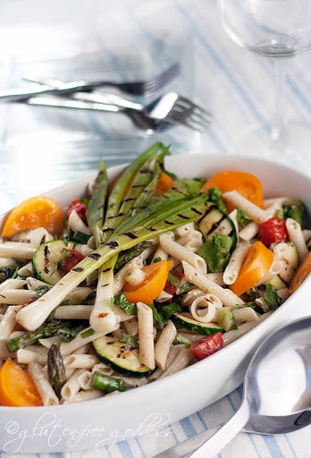 This light and fresh summer pasta salad is our favorite picnic food. We love the smoky depth from the grilled veggies. If you don’t have an outdoor grill, you can grill your veggies using a cast iron grill pan. It works beautifully. Grill the veggies as the brown rice penne is cooking.