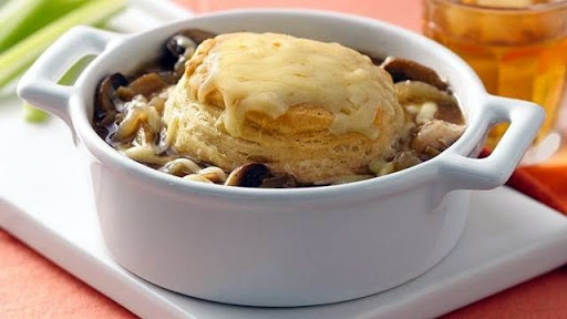 3. Spoon chicken into ramekins (about 1/2 cup each). Spoon onion mixture over chicken (about 2/3 cup each). Sprinkle with pepper. Separate dough into 8 biscuits. Place 1 biscuit in each ramekin.