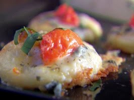 Roll out the pizza dough to 1/4-inch thick. Using a 2 to 2 1/2-inch diameter cookie cutter, cut out 18 circles from the dough. Arrange the circles on a heavy large baking sheet. Sprinkle the Gorgonzola cheese over the circles. Top with the tomatoes, pressing them gently into the dough. Bake until the pizzettes are golden brown, about 10 minutes. Drizzle the pizzettes with oil. Sprinkle the basil over the pizzettes. Sprinkle with salt and pepper. Arrange the pizzettes on a platter and serve immediately.