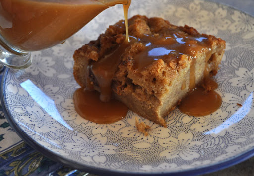 Preheat the oven to 350F degrees. Put the cubed bread crumbs in a large bowl; set aside. In a medium bowl, combine melted butter, milk, beaten eggs, brown sugar, raisins, cinnamon, and vanilla. Pour mixture over bread and set sit for 45 minutes, giving the bread an occasional stir. Butter a 9 x 13 baking dish and transfer the bread and any liquid into the butter dish. Bake, uncovered, for 40 minutes. Remove bread pudding from oven and let cool on rack for 20 minutes. While bread pudding is cooling, make the caramel sauce. *Note- the bread pudding can be served warm or at room temperature.