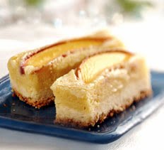 6. Cut each peach into 12 slices. Place slices in 6 rows of 6 slices each over almond paste mixture. Bake