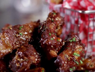 Heat a pan on medium-high heat. Add the ribs and coat with sauce. Toss to coat completely (you may have to do this in two batches). Plate and sprinkle with toasted sesame seeds. You can add sliced scallions or fresh chiles if desired.