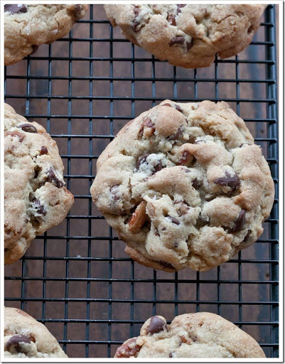 Reduce speed to low and add the dry ingredients, mixing until just incorporated. Mix in the chocolate chips and pecans, if using. Gently press plastic wrap against the surface of the dough and refrigerate for 24 to 36 hours. The dough may be used in batches, and can be refrigerated for up to 72 hours.