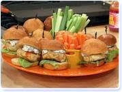 Add burgers to the hot pan and cook 4 minutes on each side. Then, pile on buns with lettuce or cress, a dollop of blue cheese topping and garnish with chives. Serve with carrot and celery sticks alongside.