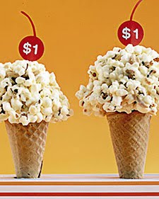Cones filled with marshmallow-almond popcorn stand in a paper-wrapped aluminum-foil box with small holes.