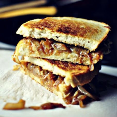 On a preheated griddle or large skillet; place a slice of buttered bread (butter side down) and top it with a little shredded smoked Gruyere. Add half of the onion mixture and then more of the cheese. Top with a second slice of buttered bread (butter side up).