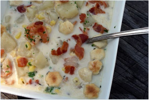 Peel, clean and tail your shrimp and cut the corn from the cobs. Place the shrimp shells and tails, and the cobs (milked with the back of a knife) into a pot with the chicken broth. Bring it to a boil, reduce heat and let simmer ~15 minutes. Strain out the solids and return to heat to keep warm.