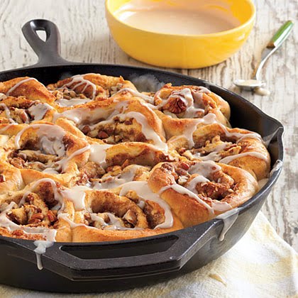2. Prepare hot roll dough as directed on back of package; let dough stand 5 minutes. Roll dough into a 15- x 10-inch rectangle; spread with softened butter. Stir together brown sugar and cinnamon; sprinkle over butter. Sprinkle pecans over brown sugar mixture. Roll up tightly, starting at one long end; cut into 12 slices. Place rolls, cut sides down, in a lightly greased 12-inch cast-iron skillet or 13- x 9-inch pan. Cover loosely with plastic wrap and a cloth towel; let rise in a warm place (85°), free from drafts, 30 minutes or until doubled in bulk.