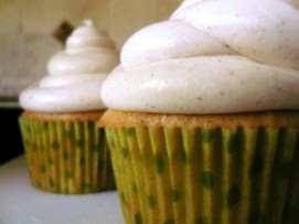 Place frosting in a piping bag or a plastic baggie with the corner cut off. Lavish on the peach cupcakes.