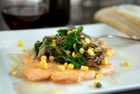 Pan Seared Salmon with Maitake, Italian Basil, Sweet Corn and Watercress Sautee