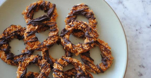 Spread the remaining ¼-cup of caramel onto the cooled cookies and then press on a portion of the coconut mixture with hands or a spatula. Let the cookies cool for 30 minutes.