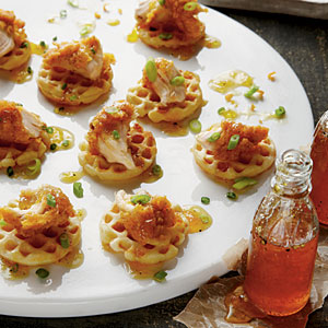 2. Cook batter in a preheated, oiled mini-style waffle iron 3 1/2 to 4 minutes or until golden (about 1/2 Tbsp. batter per waffle). Top waffles with chicken, and drizzle with Peach-Horseradish Maple Syrup.