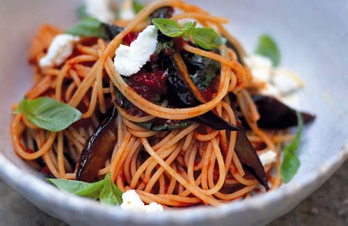 Put 1 lb cubed eggplant on foil lined baking sheet coated with olive oil spray. Broil 5 inches from heat, stirring until golden brown and tender, about 8 minutes. Heat 1 Tbsp olive oil in nonsticke frying pan over medium high heat. Add 3 cups halved cherry tomatoes and 1 cup chopped red onion. Cook until tomatoes are just wilted about 3 minutes. Toss whole wheat spaghetti with eggplant and tomatoes. Serve topped with fresh basil, parsley and shaved riccotta salata.