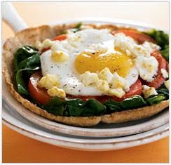 Divide tomatoes and spinach evenly among pita halves, leaving an empty space in the center of each for an egg. Crack 1 egg into the center of each pita. Sprinkle with salt and pepper, return to the oven, and bake until yolks are lightly set, 8 to 10 minutes. Sprinkle with cheese and continue baking until cheese has softened, about 2 minutes more. Serve warm.