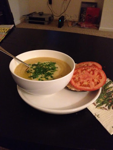 First, put the butter and olive oil in a large soup pot and melt on medium high heat. More butter or oil can be added to taste later. Dice the onion. Add the onion into the pot of hot butter and oil and sauté till soft, not brown, stirring occasionally. Smash, peel, and chop the garlic and add to the cooked onions. Stir occasionally. Peel and dice the carrots. Add to the onion and garlic. Next, cut the stem off of the cauliflower. Cut as much off as you can while still keeping florets in tact. Then, dice the stem and add to the pot. Peel and dice the potato. I like to put each chopped potato in a paper towel while chopping the others to dry some of the water. This will make them brown easier. Add the potatoes to the pot and sauté till slightly brown. This will take about 10-20 minutes depending on your stove and pot. Then add a dash of salt and pepper. Now you could add 1/4-1/2 of a boullian cube if you want for extra flavor and stir into the browned vegetable mixture. Then add the white wine. I usually add 1/4 cup but I just eyeball it. Bring to a boil and then reduce to a summer for about 3 minutes. Then, add the box of broth. Add the cauliflower florets to the pot. Bring to a boil, cover, and reduce to a summer for 30-45 minutes. Basically until the florets are tender and the liquid is the right amount for your liking. Once that is done, take a hand blender (a regular blender, food processor, or potato masher are fine substitutes if you don't have ah and blender) and purée to your favorite texture. You can eat like this, but I like to add some heavy cream or milk to make it creamy. I use about 1/4 cup, but I eyeball it. A little goes a long way! Stir, and salt and pepper to taste if necessary. Then I chop some chives as needed and add to the top of each bowl for color. On the side I serve with bread topped with tomatoes. The nice freshness of the tomato pair really well with the hearty soup. Enjoy!
