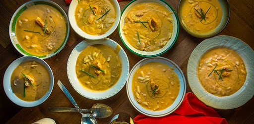 2. Make the soup: Place a large wide pot over medium heat. Add ½ cup olive oil. When it starts to shimmer, add the onions and cook, stirring often, until translucent, about 7 minutes. Add two big pinches of salt, the minced garlic and remaining bay leaf and cook, stirring constantly, until the garlic fragrance mellows, about 2 minutes more. Add the tomato paste or anchovies (tomato paste will make the soup a pink color) and stir until dissolved into the onions. Add 6 cups of beans, and stir to coat in the oil. Add 5 cups of bean cooking liquid. Let simmer for 10 minutes. Remove the bay leaf.