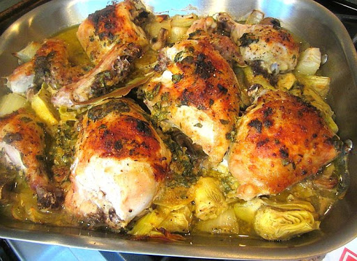 Place artichokes, onions and mushrooms on the bottom of a big pan.