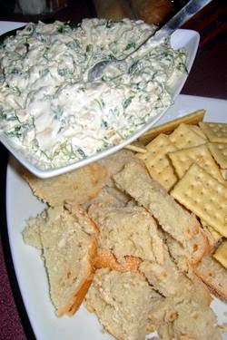 2. Remove top and interior of sourdough bread. Fill with mayonnaise mixture. Tear removed bread chunks into pieces for dipping.
