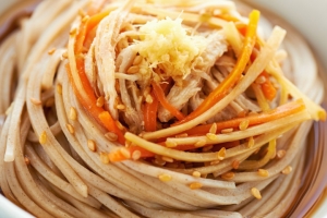 Once cooked, drain well, then transfer into a large mixing bowl. Toss the warm noodles with the veggies, herbs, and dress with enough sesame vinaigrette to coat thoroughly.