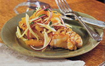 Whisk 2 tablespoons oil, vinegar, cilantro, 2 teaspoons soy sauce, ginger and sugar in medium bowl. Cut peel and white pith from oranges; discard. Holding oranges over bowl to catch juices, cut between membranes to release segments into bowl. Add fennel and onion; toss gently. Season with salt and pepper. (Salsa can be made 3 hours ahead. Cover; chill.)